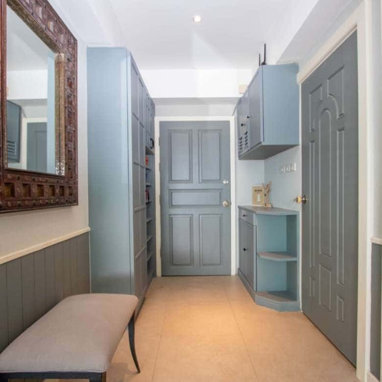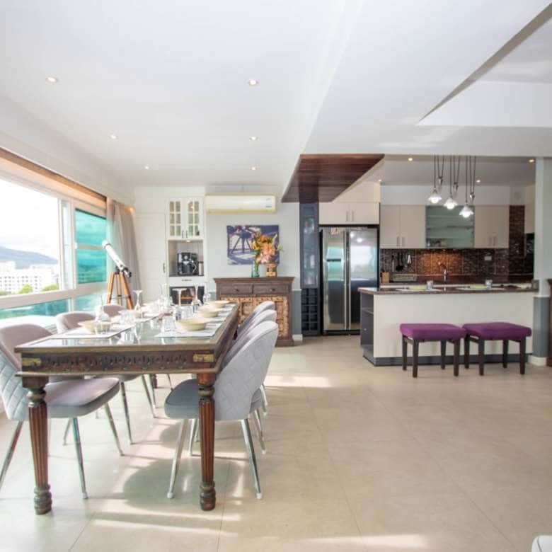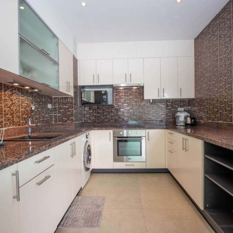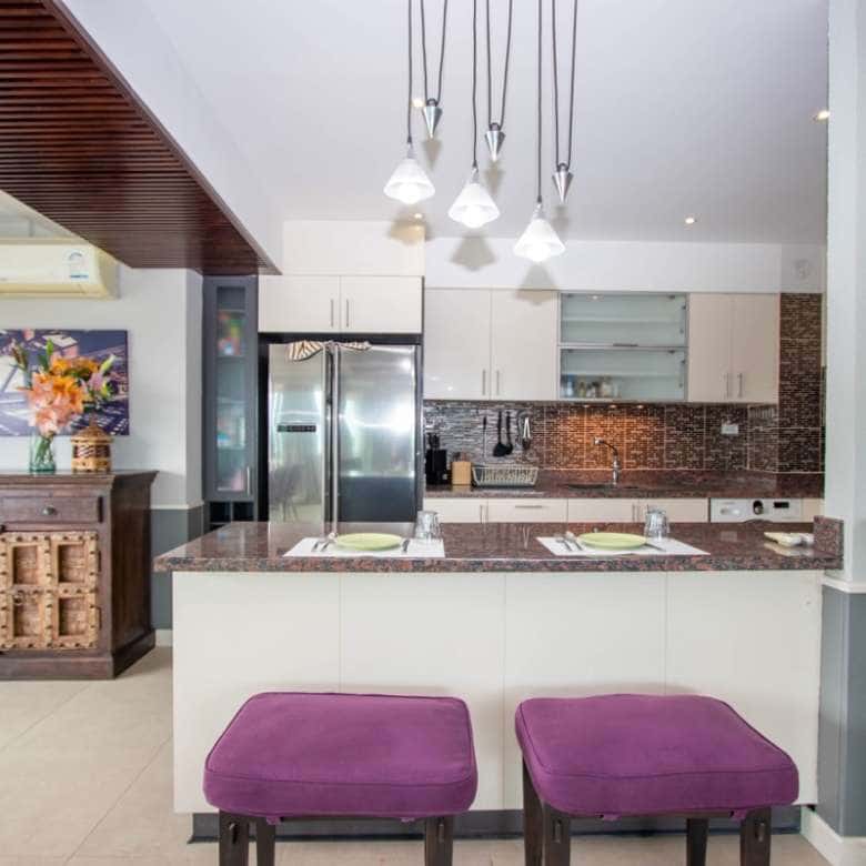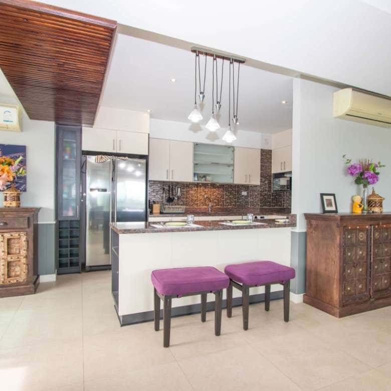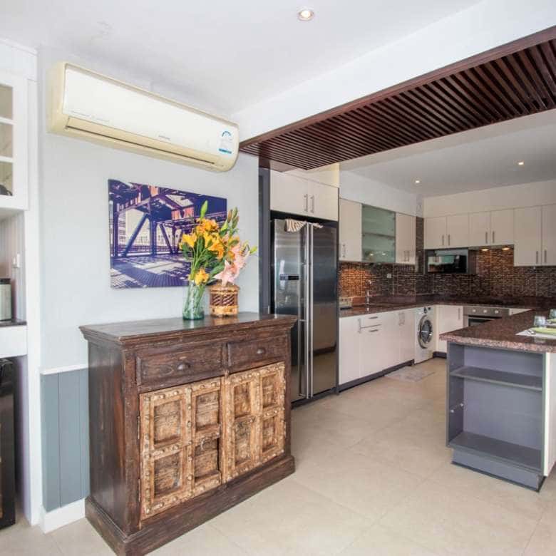 ครัวบิวท์อินพร้อมเตาอบ เตาไฟฟ้า เครื่องดูดควัน ตู้เย็นสองประตู ตู้แช่ไวน์ และเครื่องซักผ้า