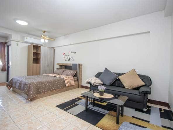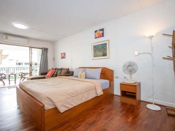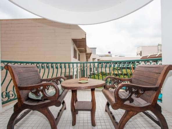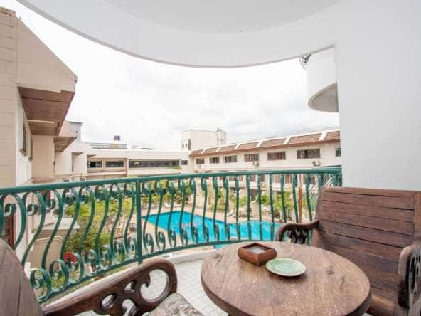 ระเบียงขนาดใหญ่เปิดรับวิวสวนและสระว่ายน้ำของโครงการ เหมาะสำหรับพักผ่อนหรือจัดมุมสังสรรค์ในยามเย็น ห้องตกแต่งครบพร้อมเฟอร์นิเจอร์และเครื่องปรับอากาศ 3 เครื่อง มอบความสะดวกสบายและบรรยากาศที่ผ่อนคลายอย่างแท้จริง