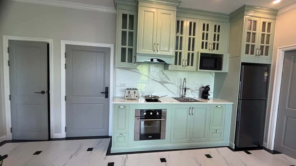 • ครัวตะวันตกครบชุดทุกชั้น (เตาอบ เตาแม่เหล็กไฟฟ้า ไมโครเวฟ เครื่องทำน้ำร้อน เครื่องซักอบผ้าในตัว)