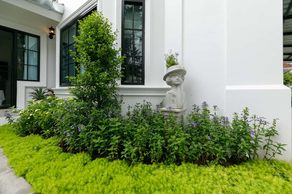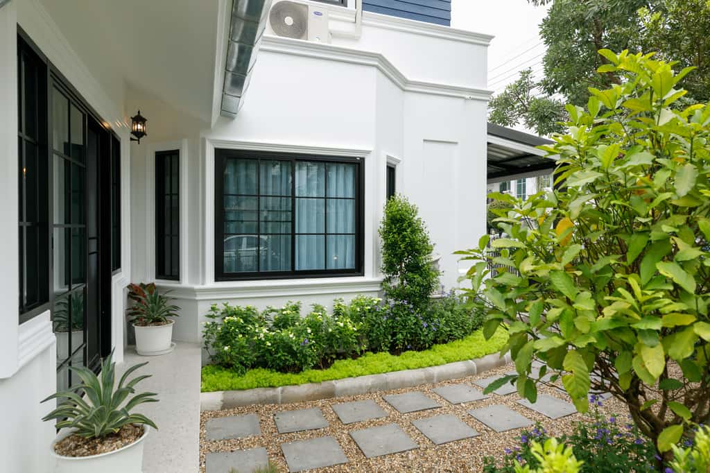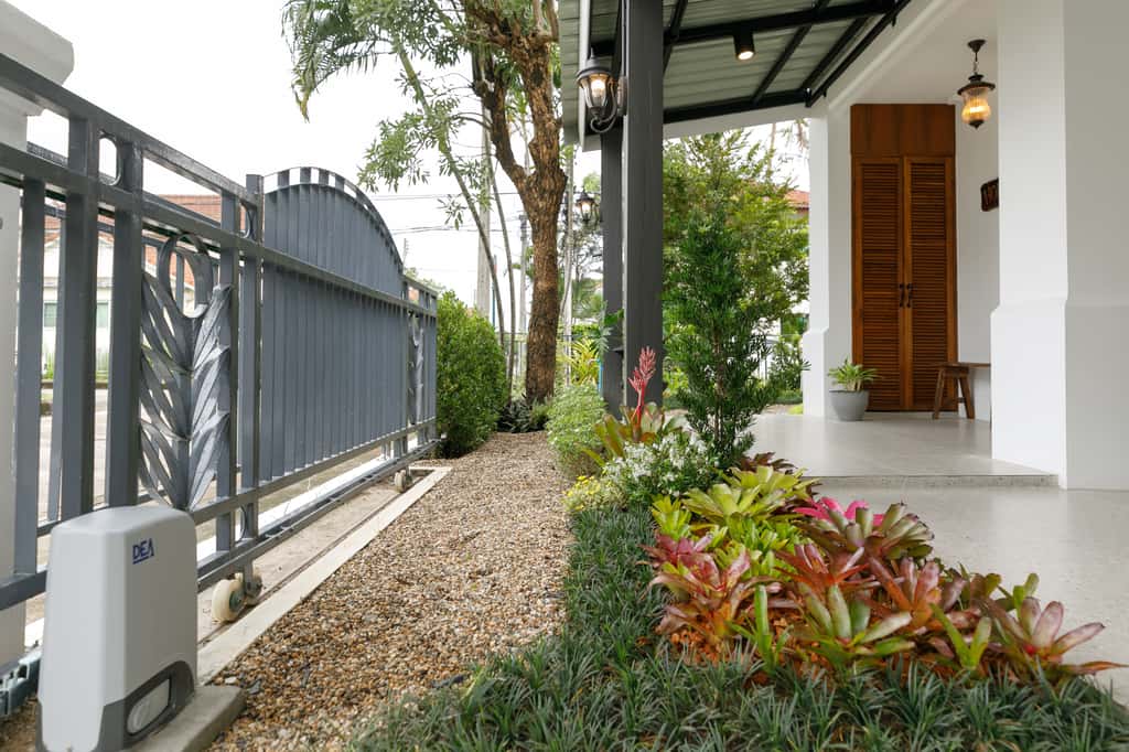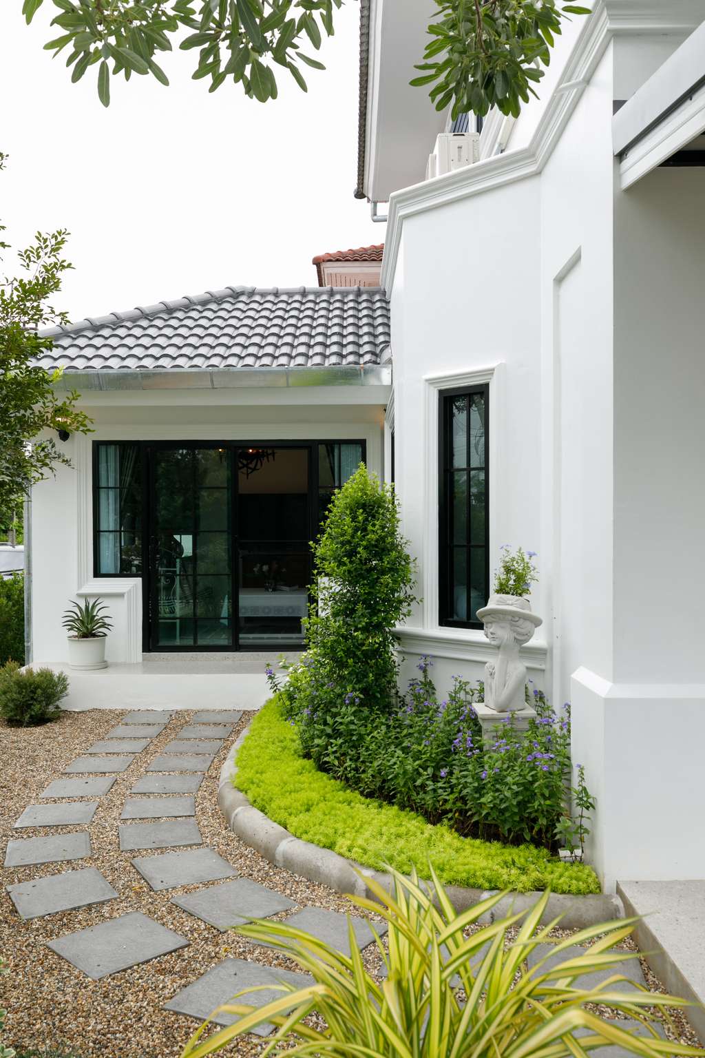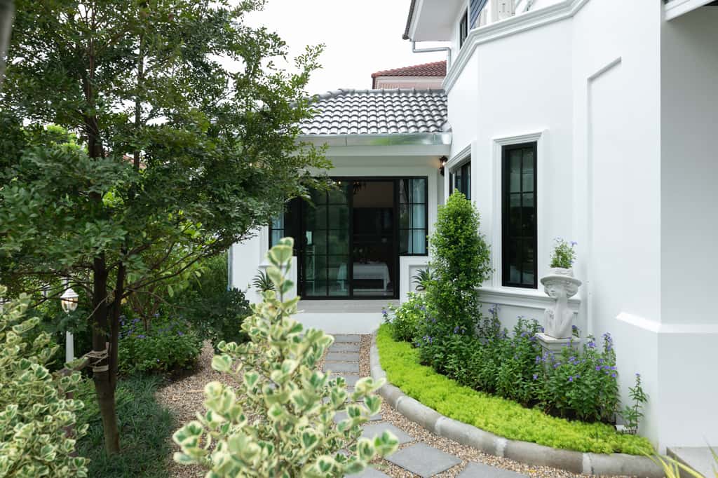 สวนหน้าบ้านปลูกต้นไม้มงคล เช่น เหลืองปรีดียาธร ล่ำซำ พุดเศรษฐี ฯลฯ
