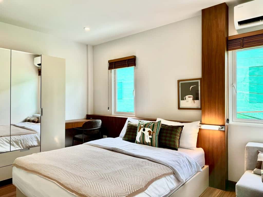 - เตียง 5 ฟุต, ทีวี 45 นิ้ว, โต๊ะทำงาน + ตู้เสื้อผ้า, แอร์ 1 ตัว
