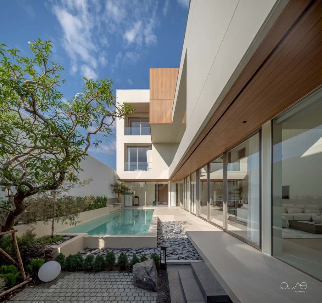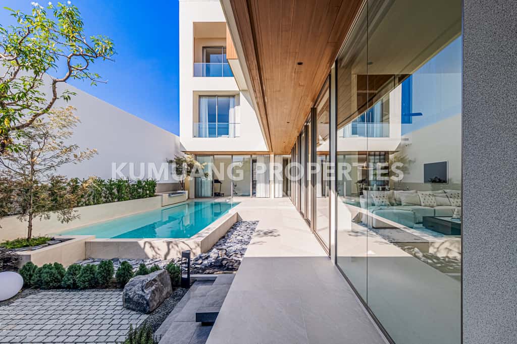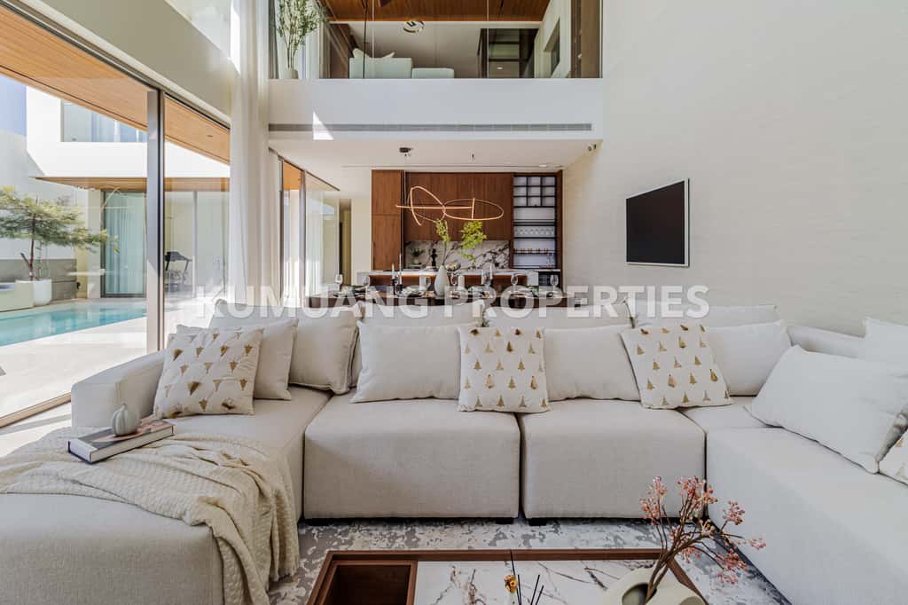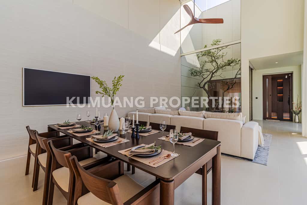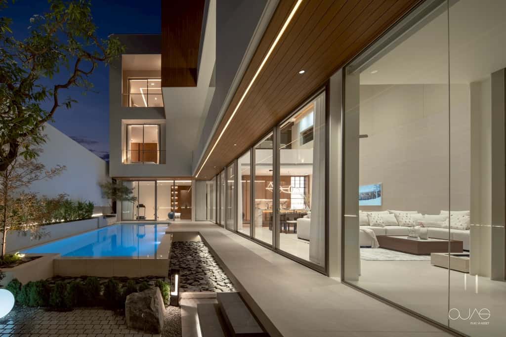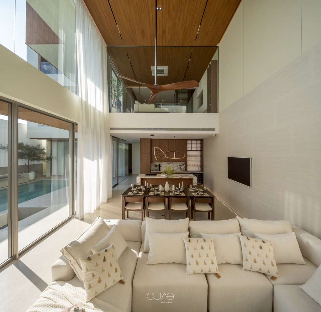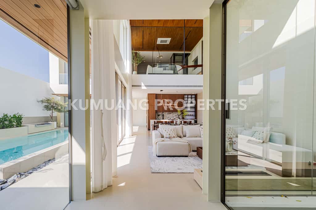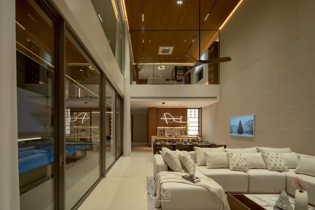 โถงรับแขก ห้องรับประทานอาหาร และครัวฝรั่งแบบ Open Plan เชื่อมต่อวิวสระว่ายน้ำ