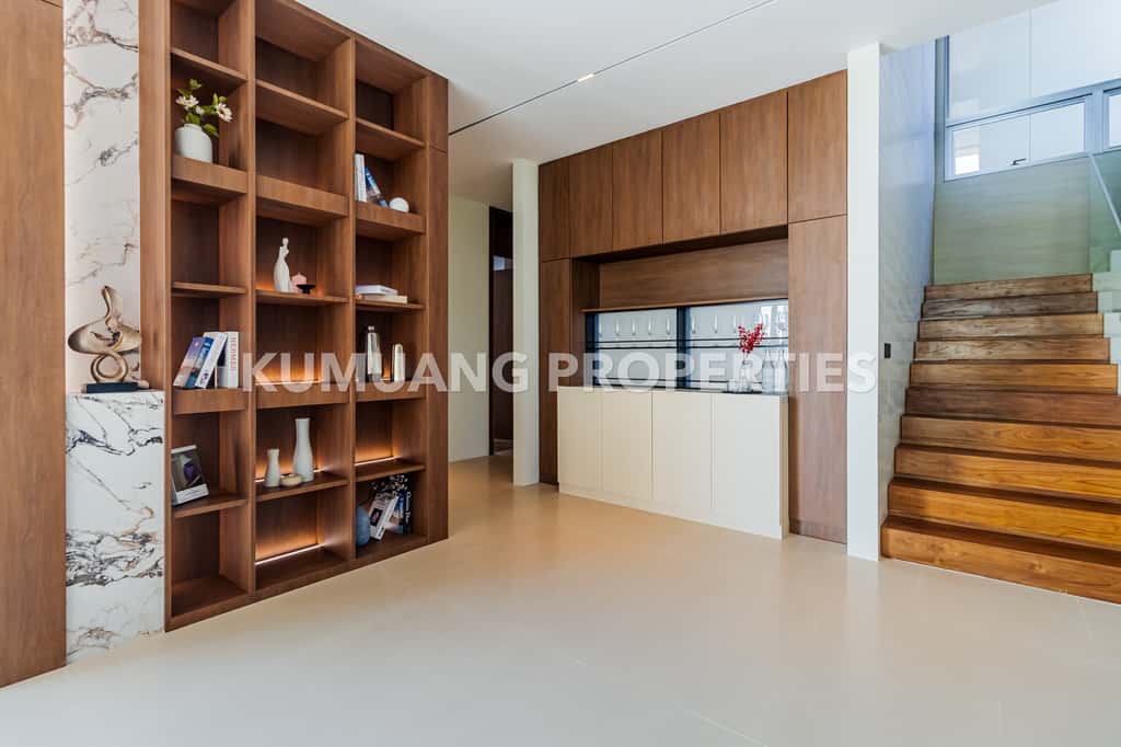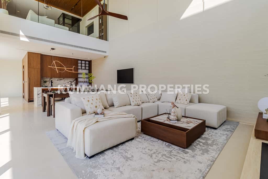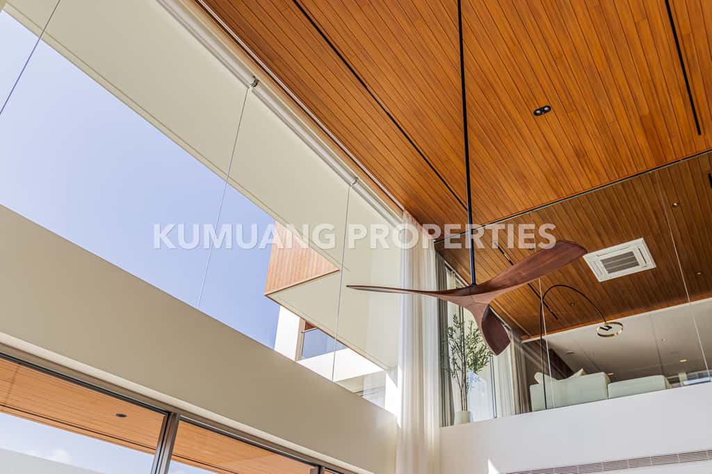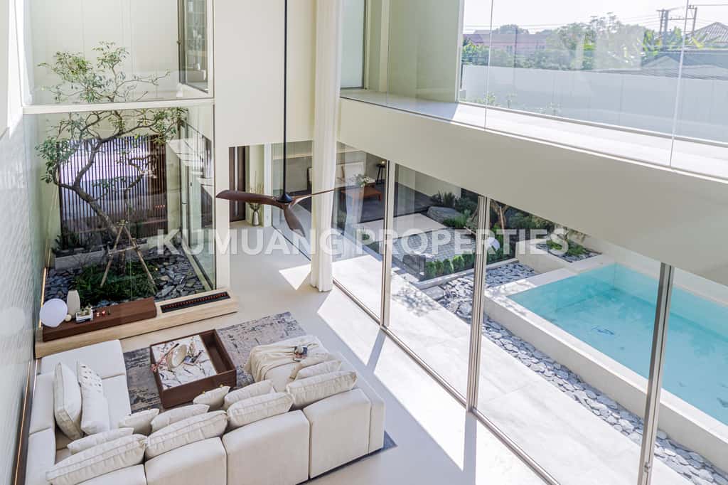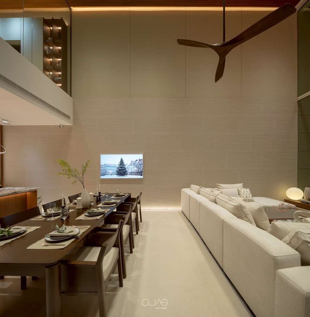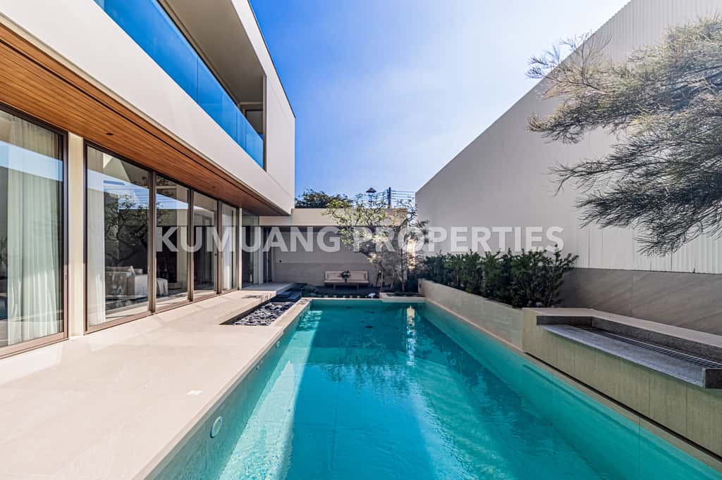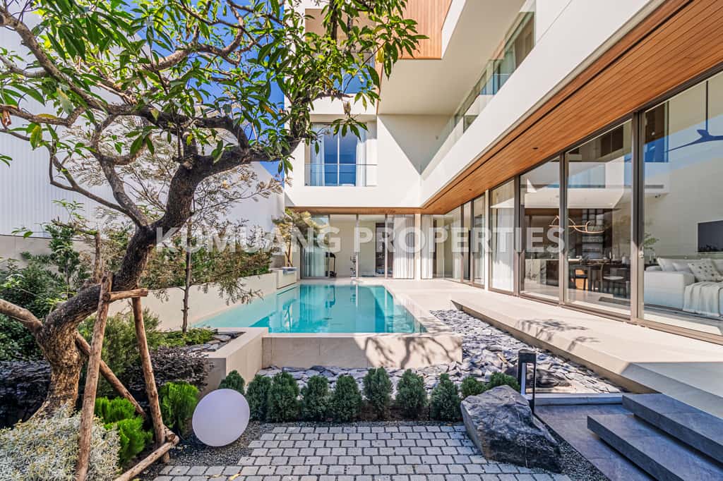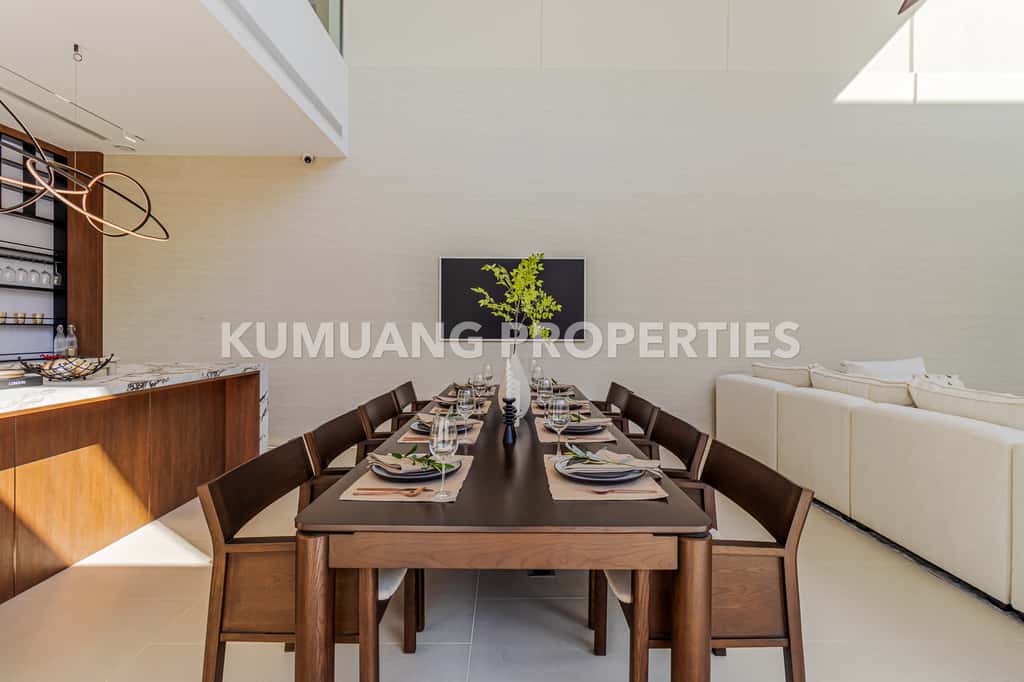 โถงรับแขก ห้องรับประทานอาหาร และครัวฝรั่งแบบ Open Plan เชื่อมต่อวิวสระว่ายน้ำ