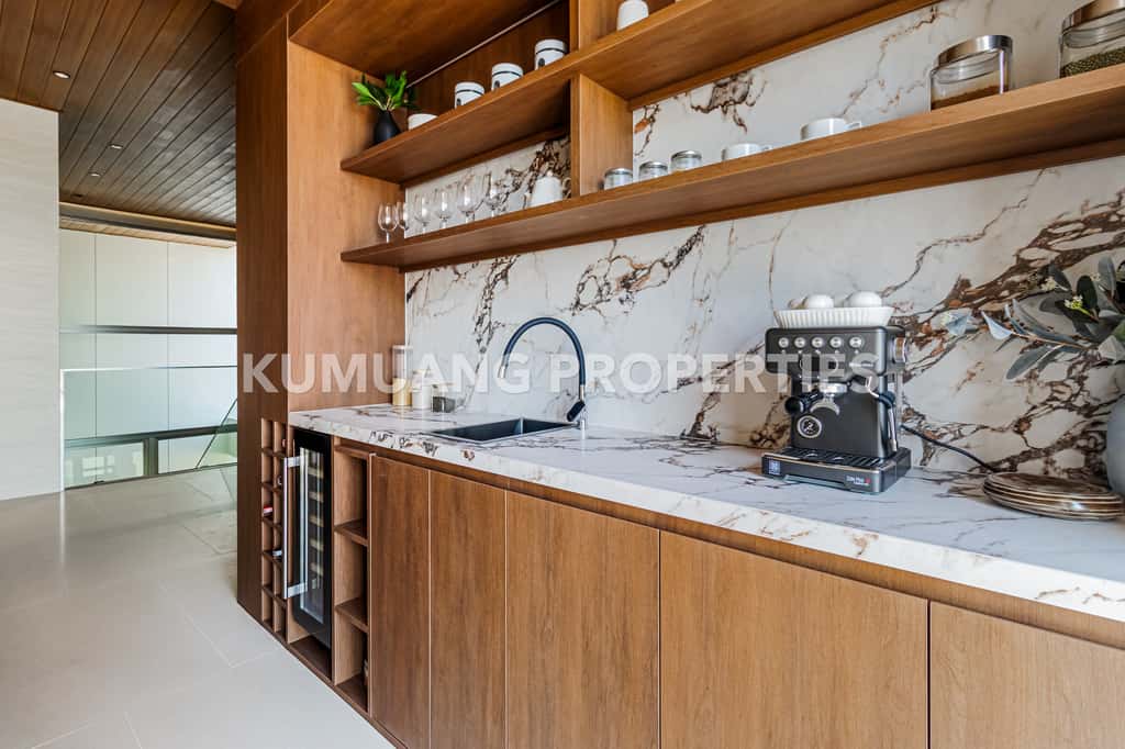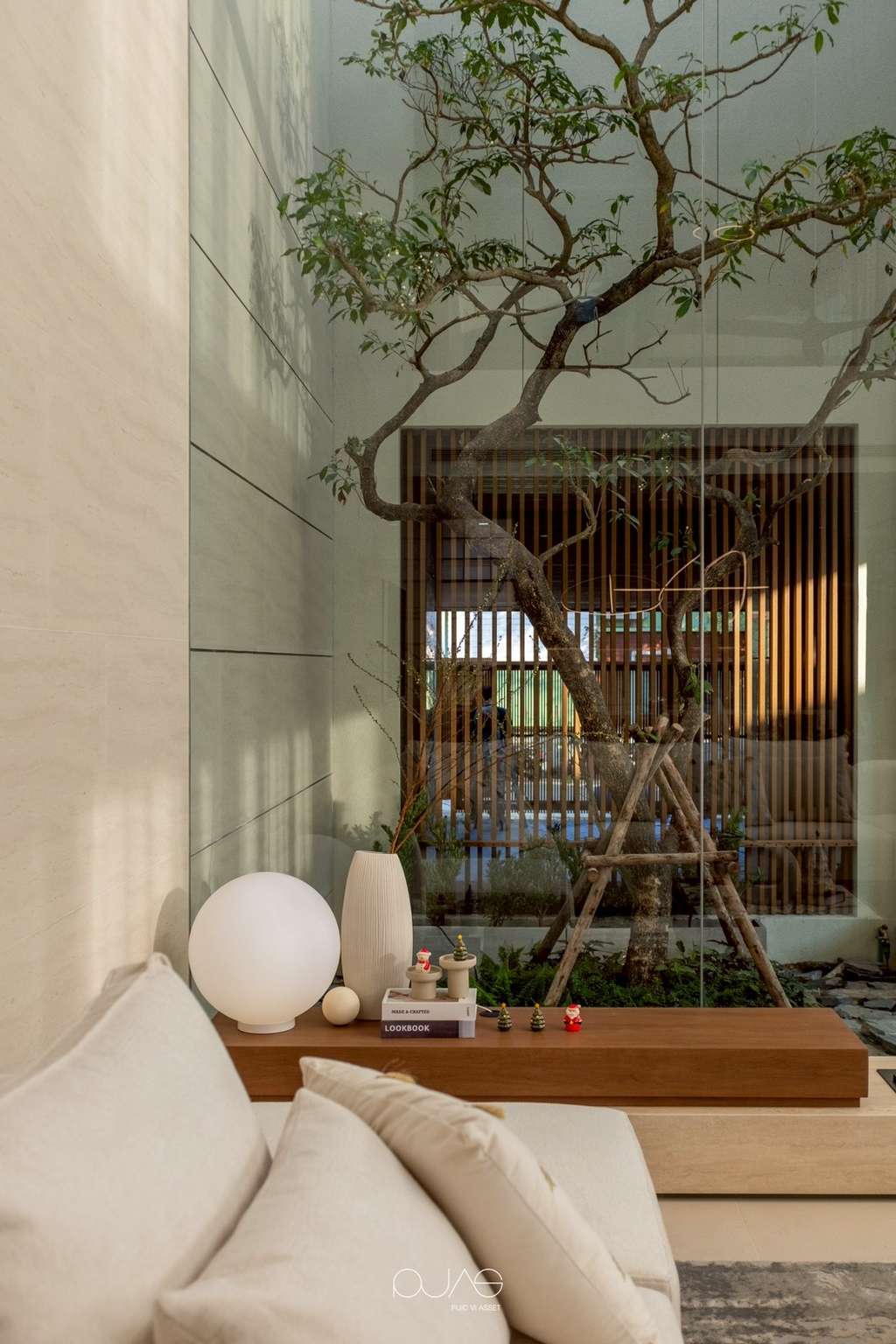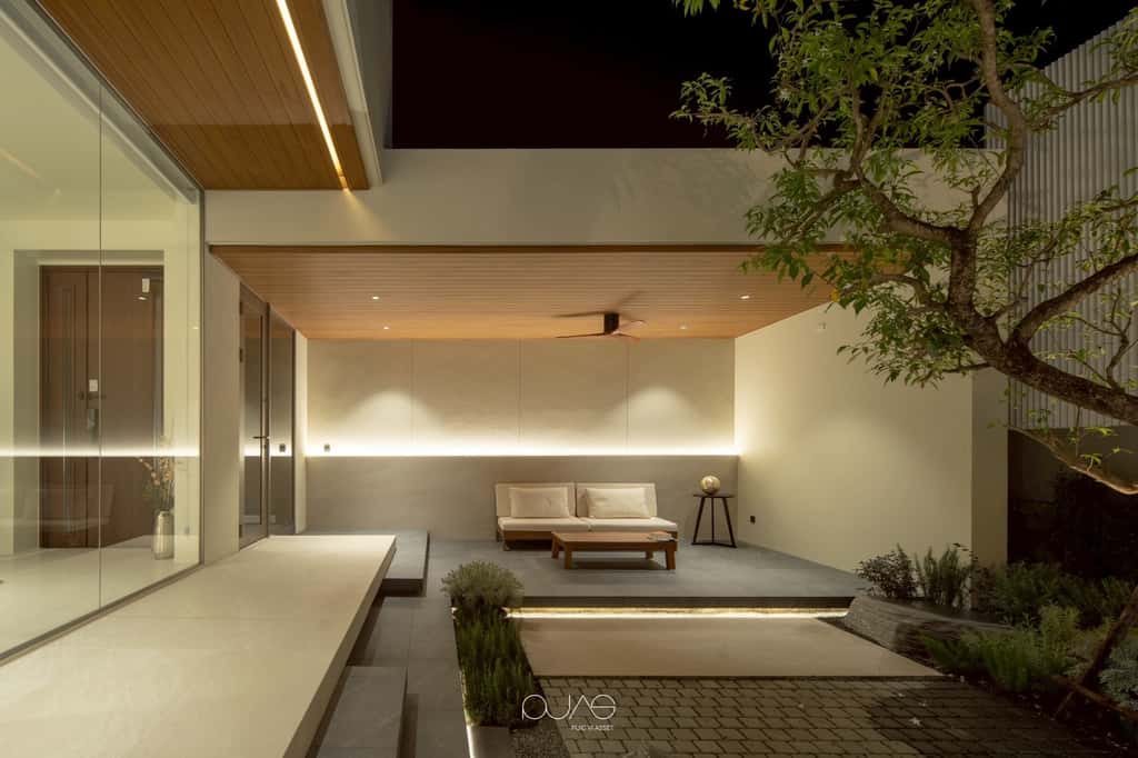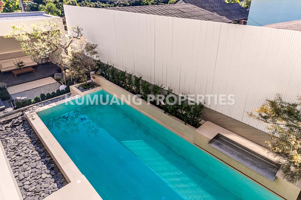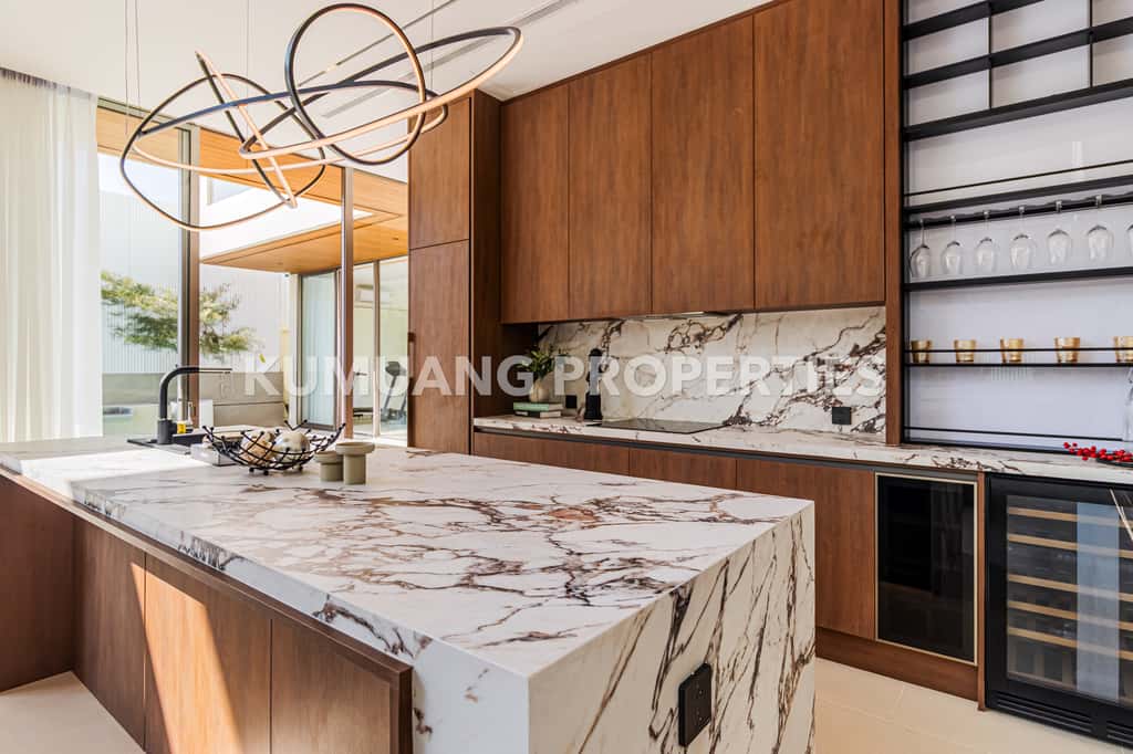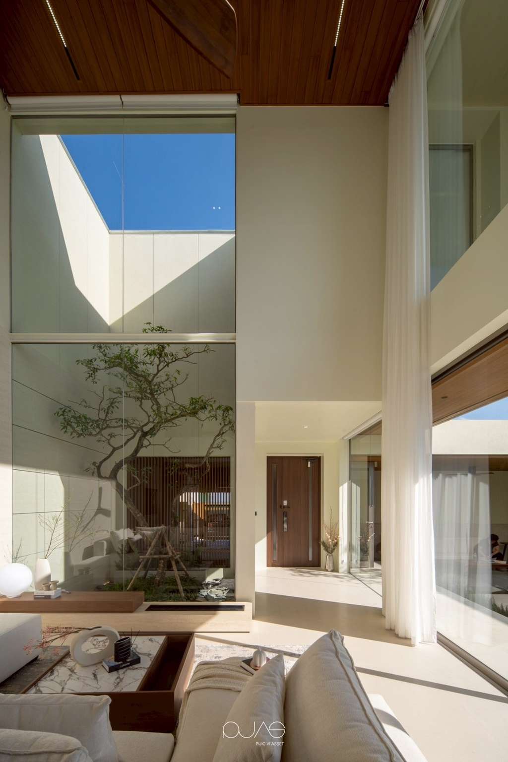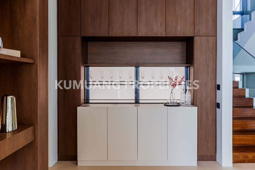 โถงรับแขก ห้องรับประทานอาหาร และครัวฝรั่งแบบ Open Plan เชื่อมต่อวิวสระว่ายน้ำ