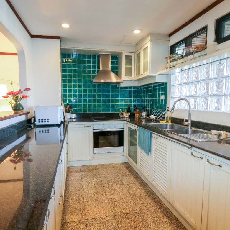 พื้นที่ครัวพร้อมตู้เย็น ไมโครเวฟ เตาไฟฟ้า และเครื่องดูดควัน