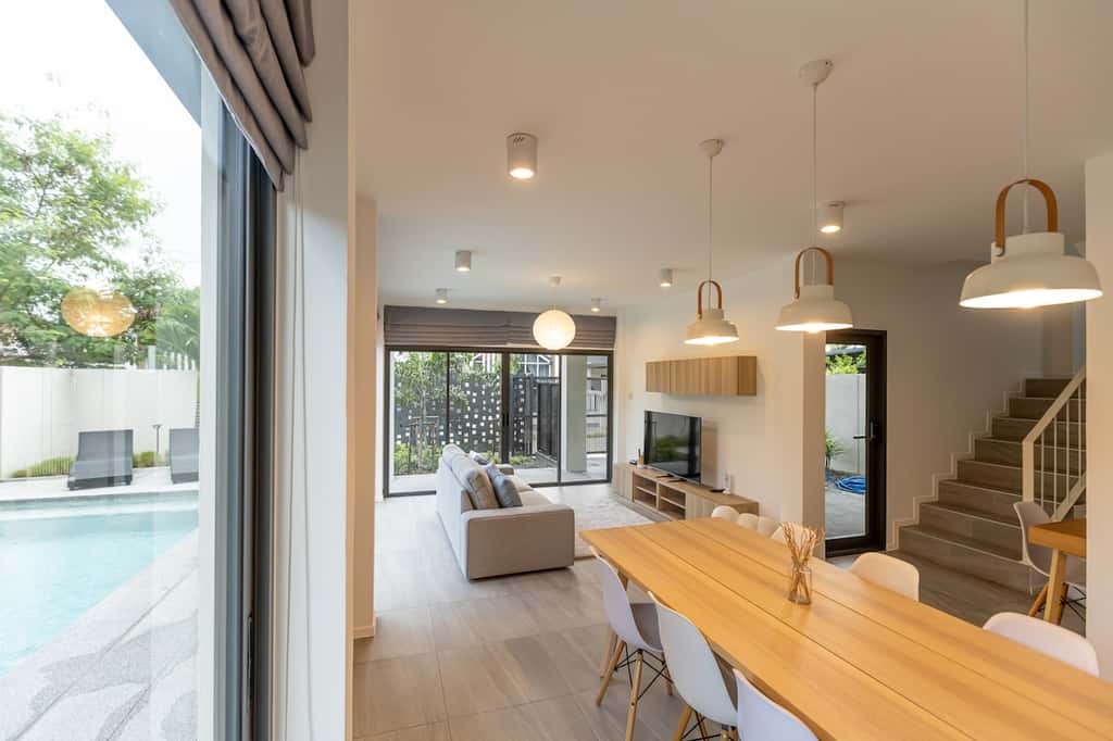 พื้นที่นั่งเล่น ห้องรับประทานอาหาร และห้องครัวแบบ Open Plan โปร่งโล่ง