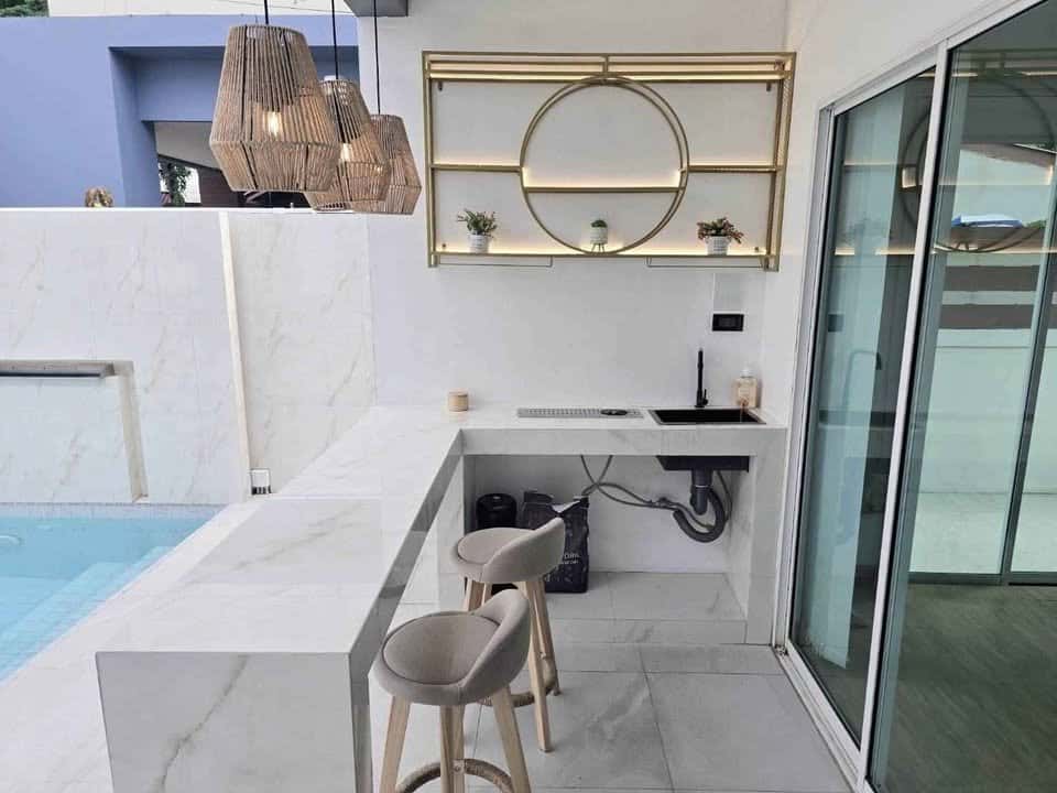 - ครัวหรูพร้อมอุปกรณ์ครบครัน เหมาะสำหรับการอยู่อาศัยจริงและการรับรองแขก