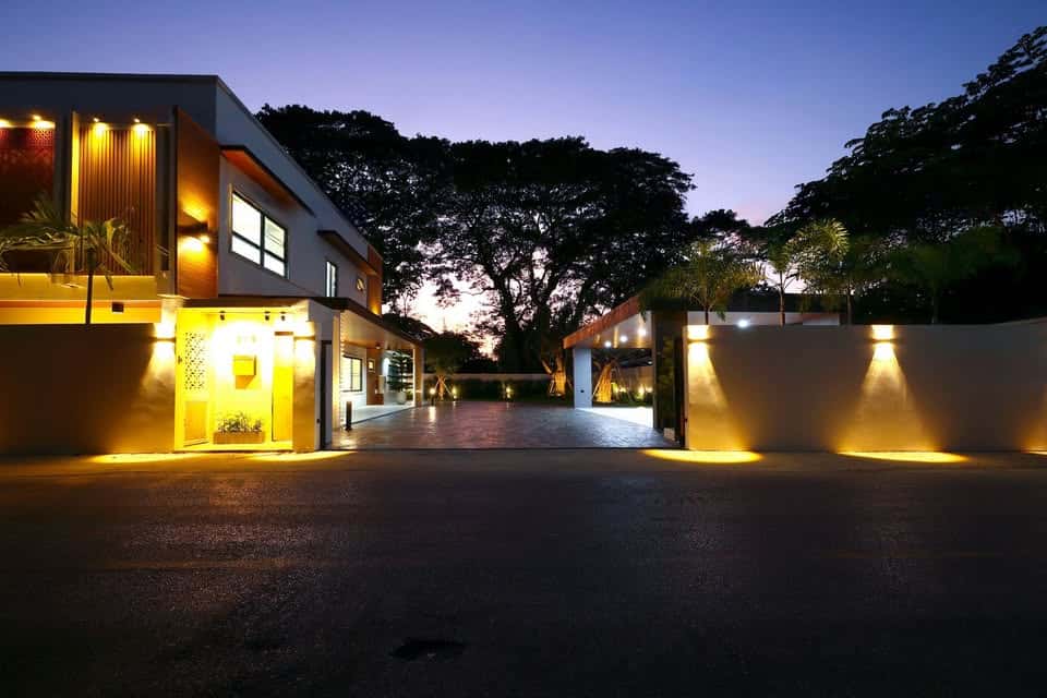 สวนรอบบ้านพร้อมไม้เสริมสิริมงคล และไฟส่องสว่างภายนอก สร้างบรรยากาศที่สวยงามในยามค่ำคืน