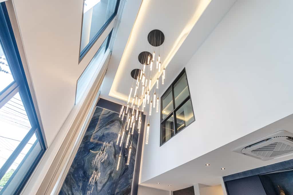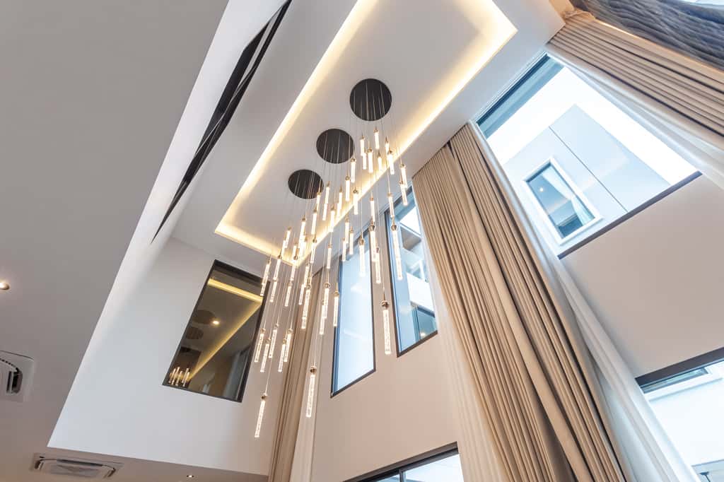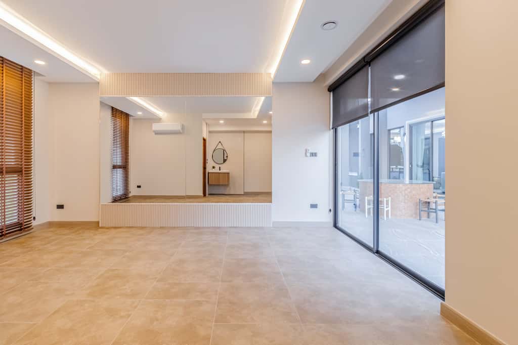 • 🛋 Grand living hall with high ceiling and open, airy space