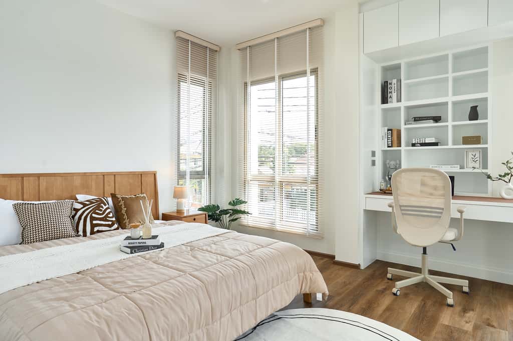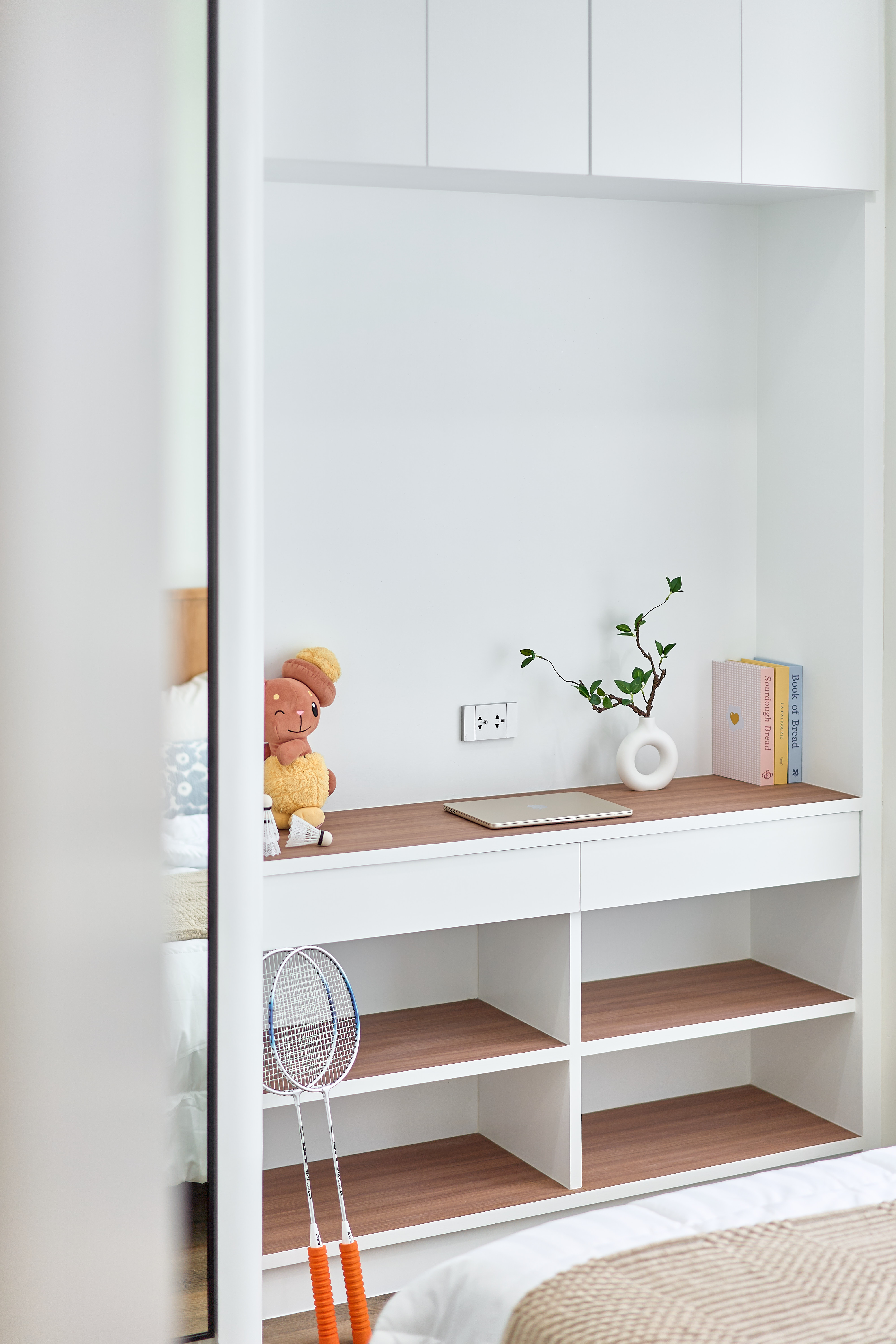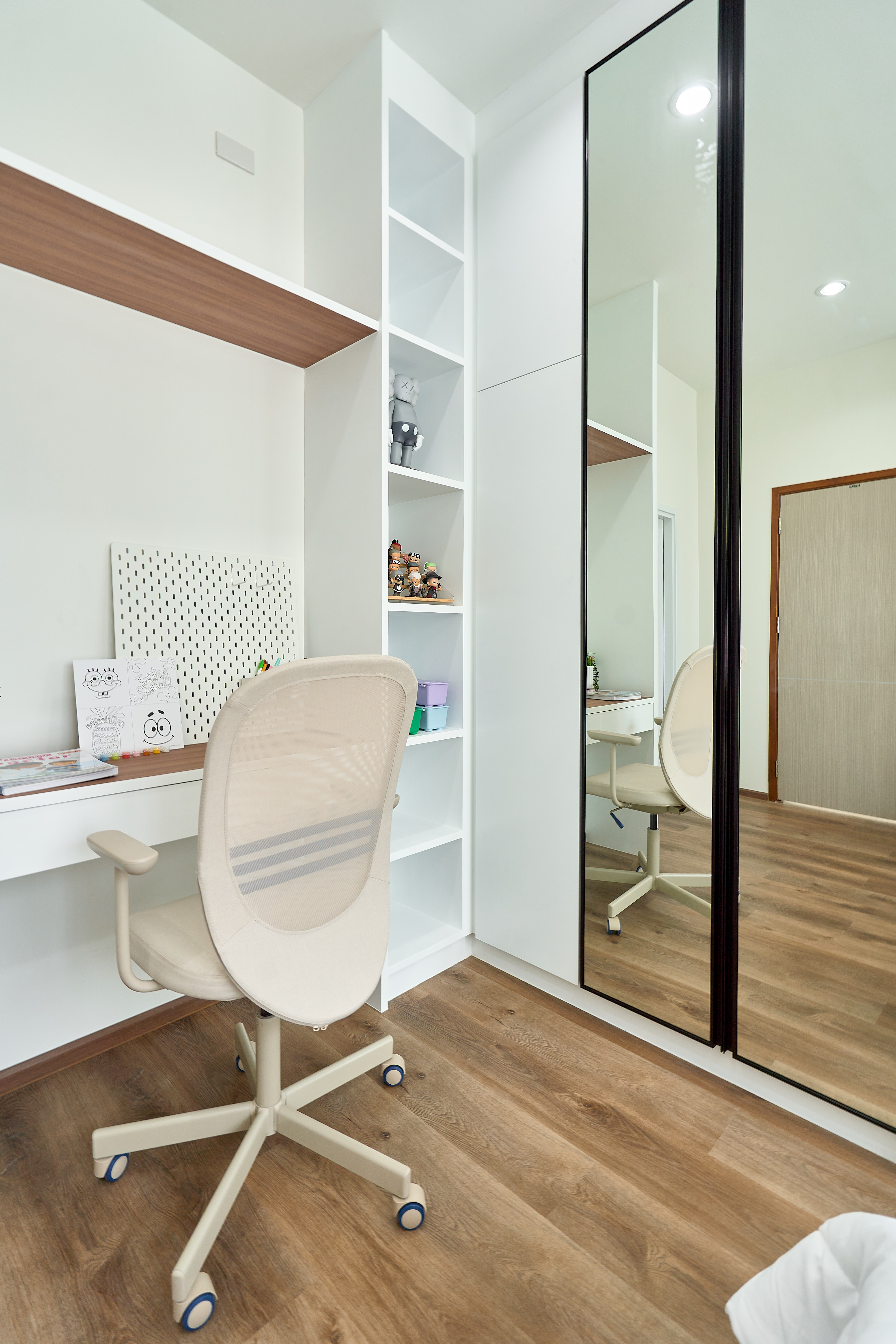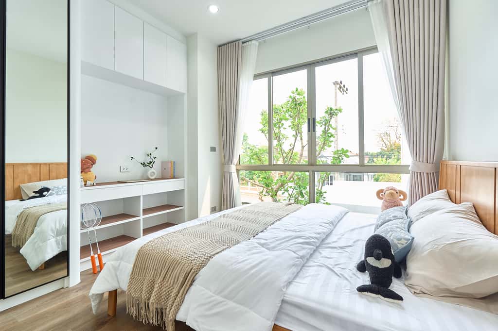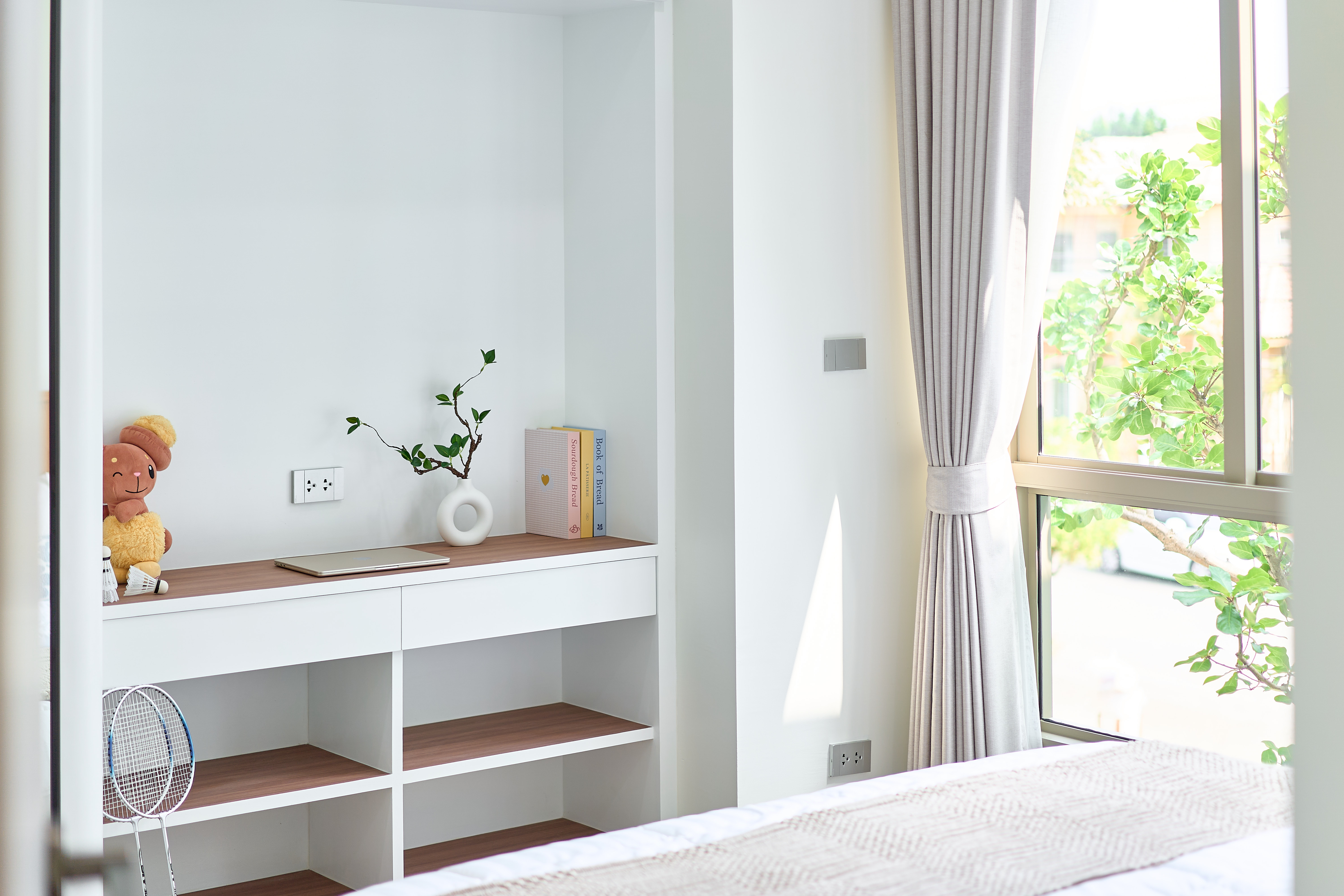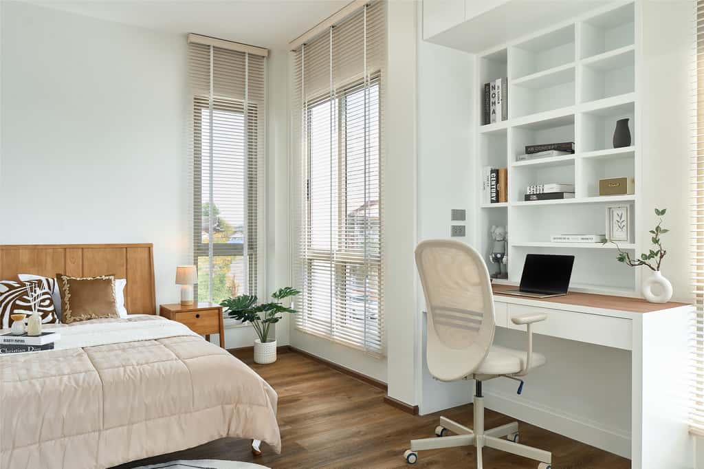 – ห้องนอนเด็ก Built-in ตู้และโต๊ะอ่านหนังสือ วิวสวนกลางบ้าน