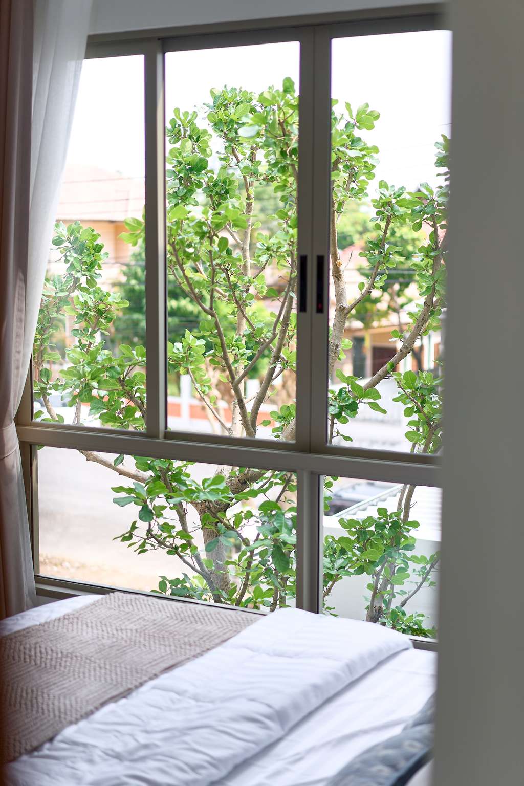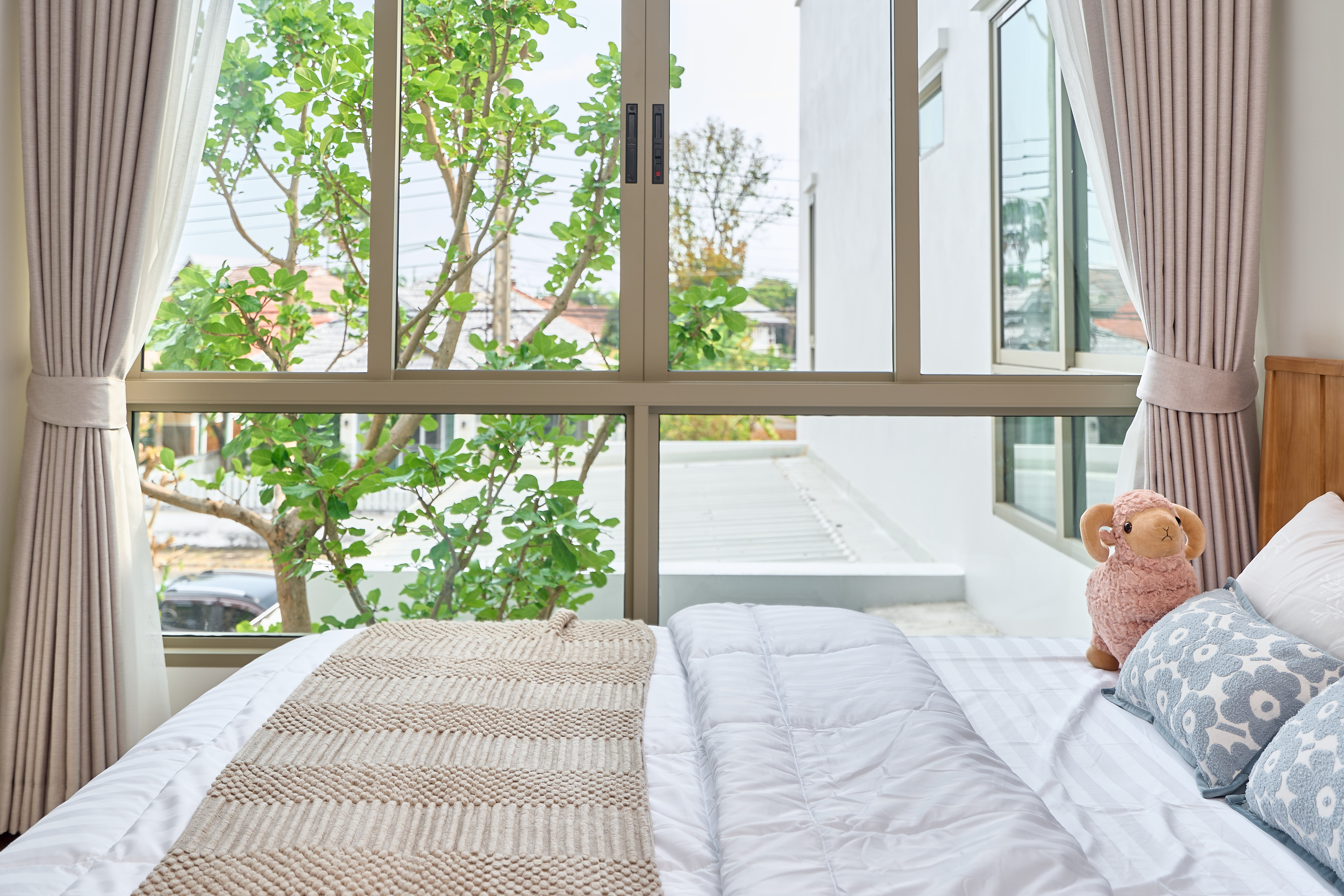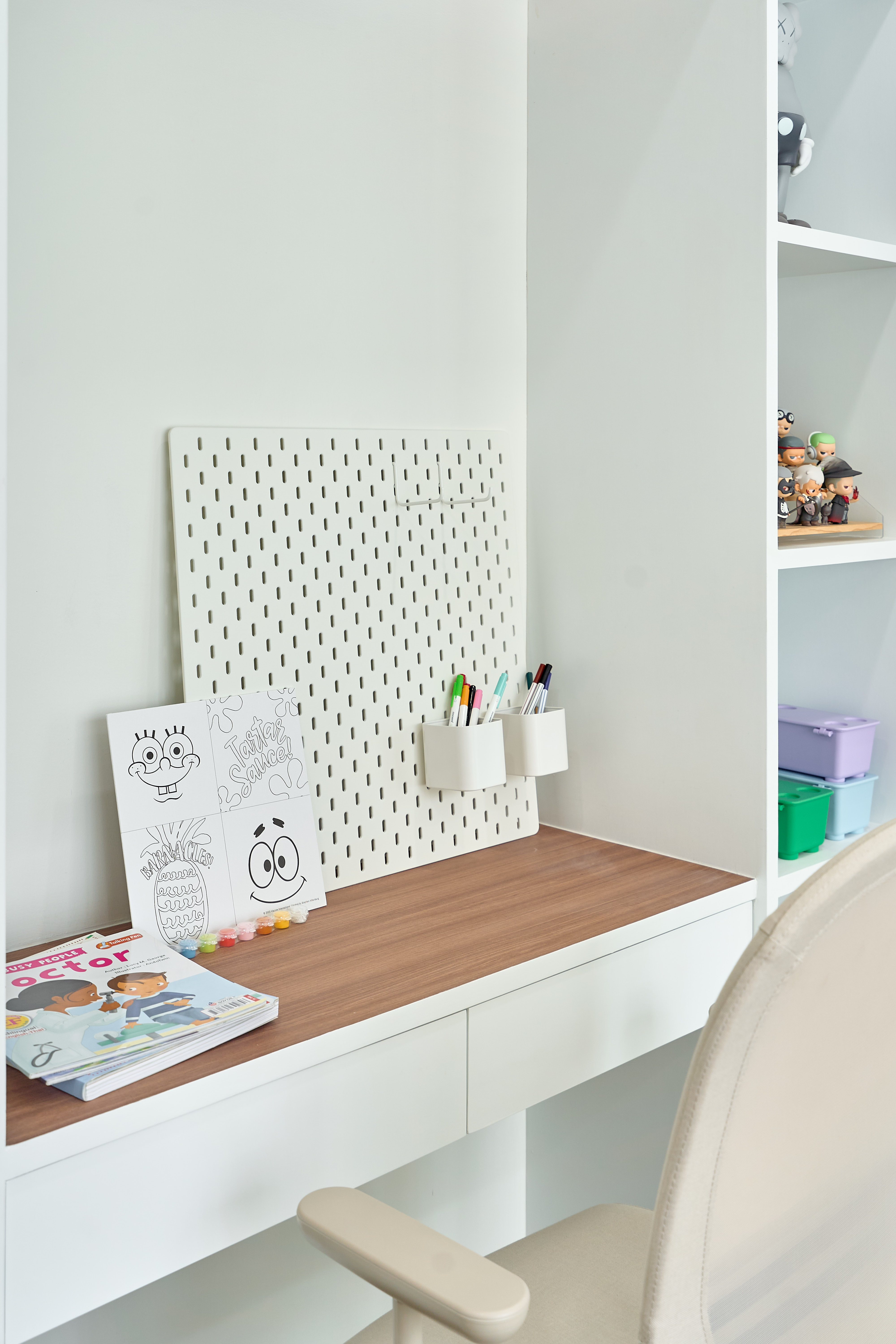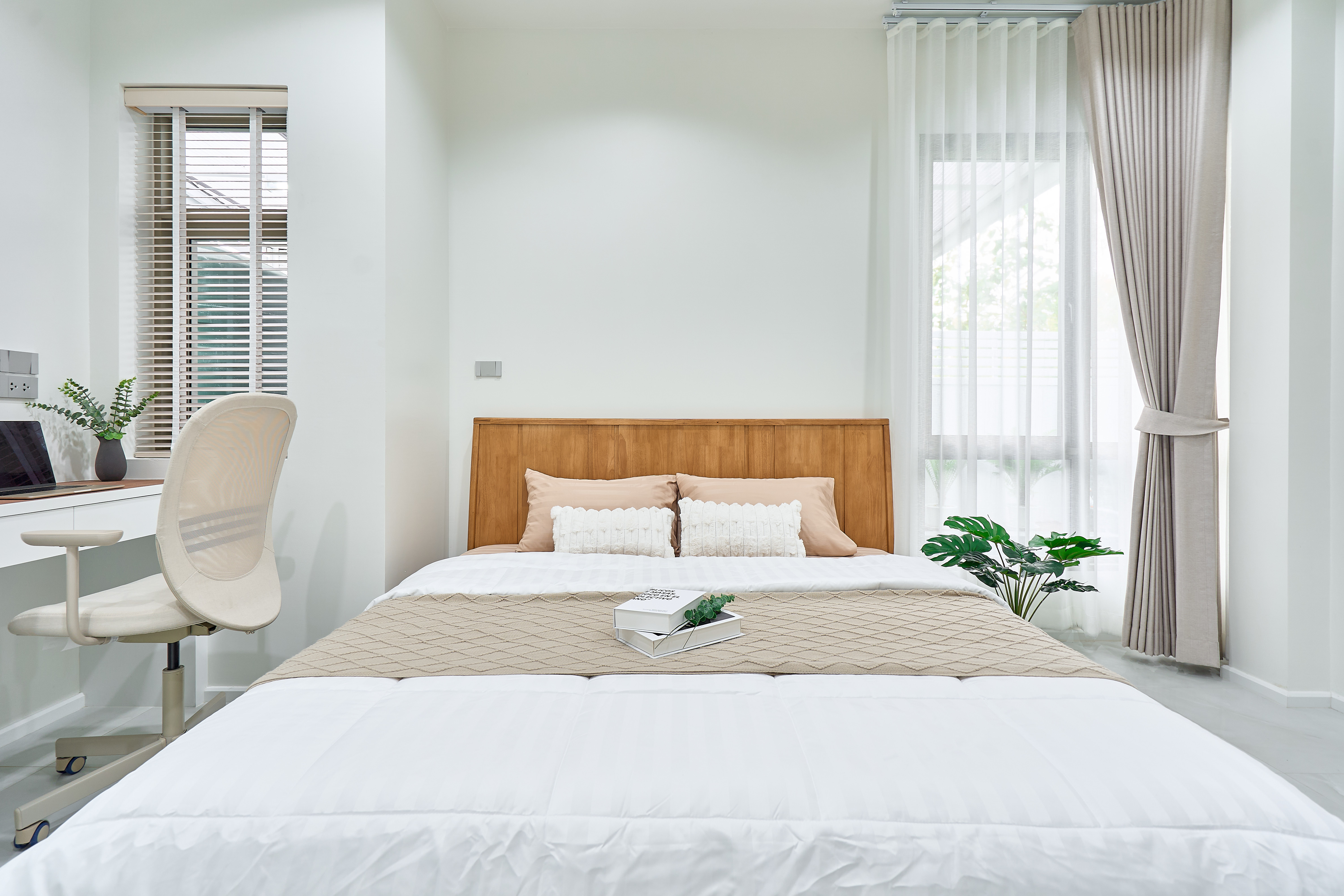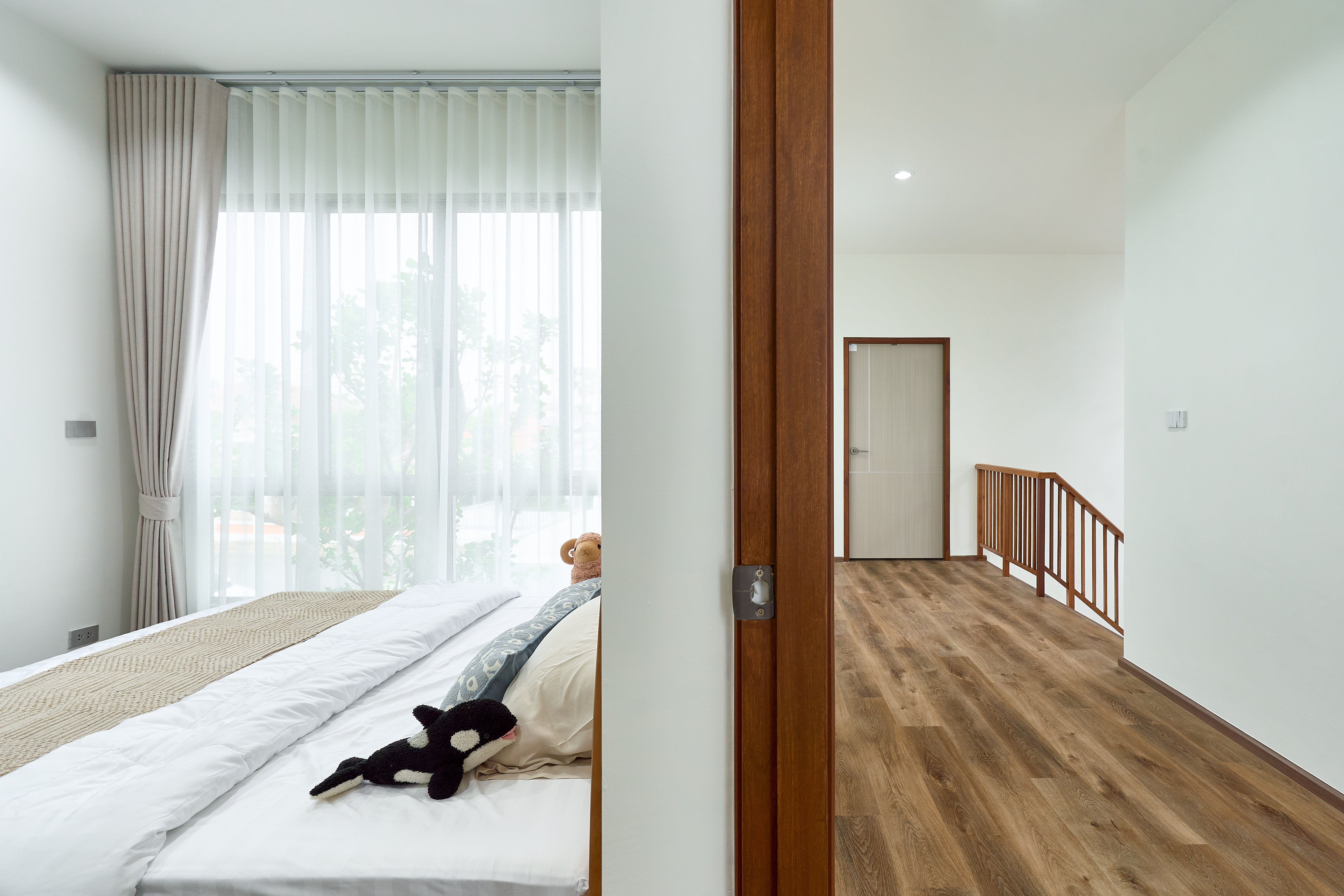 – ห้องนอนเด็ก Built-in ตู้และโต๊ะอ่านหนังสือ วิวสวนกลางบ้าน
