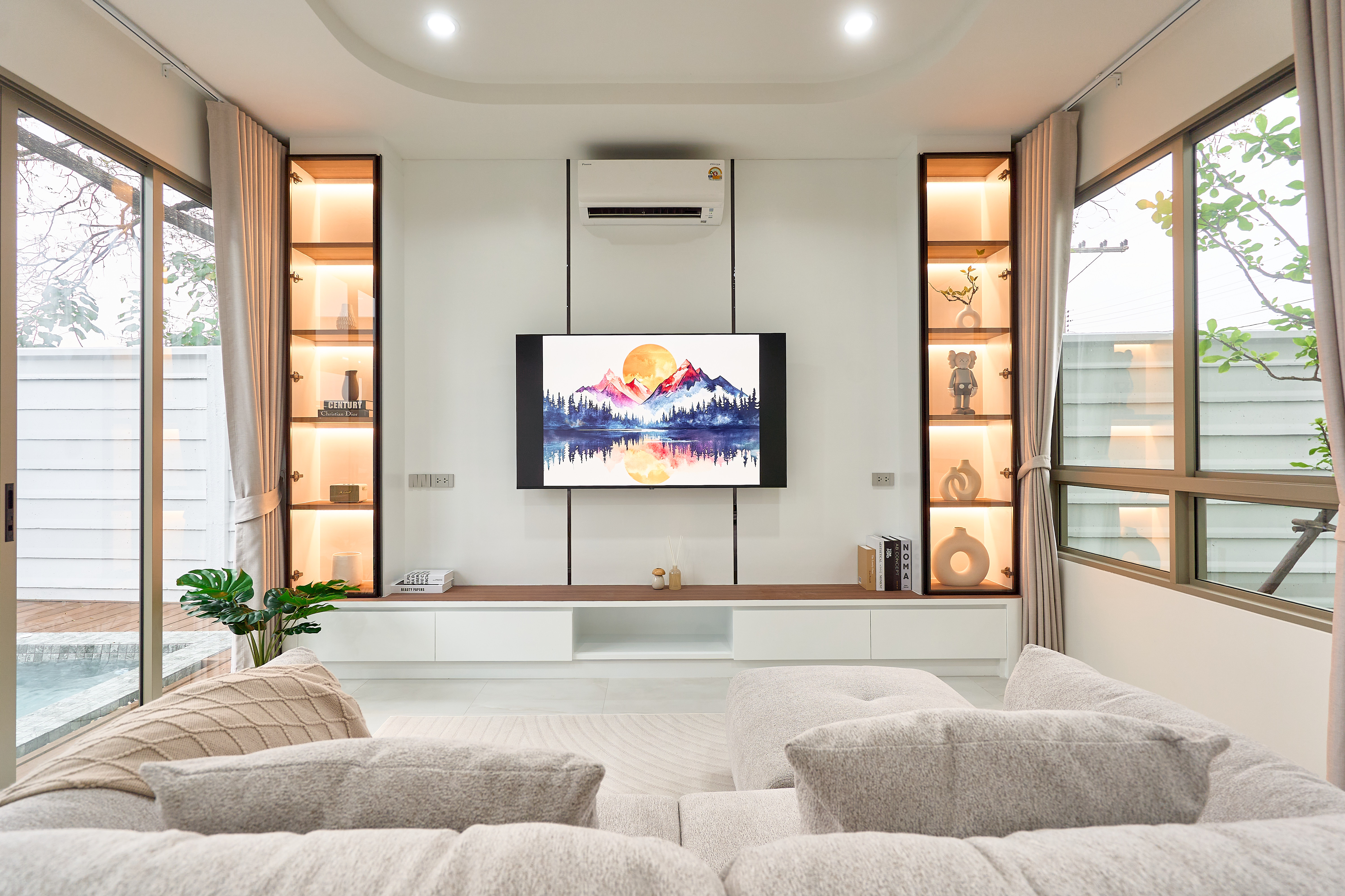– ห้องนั่งเล่นเพดานสูง โปร่งโล่ง