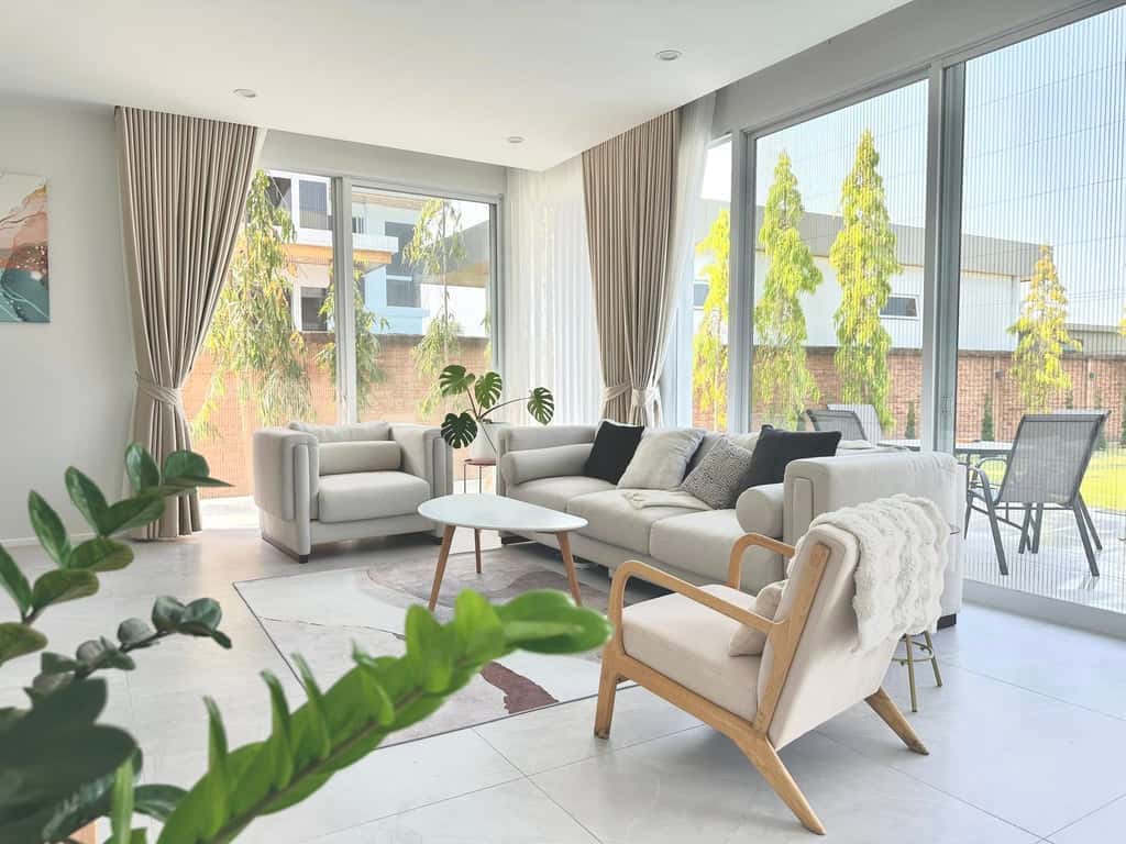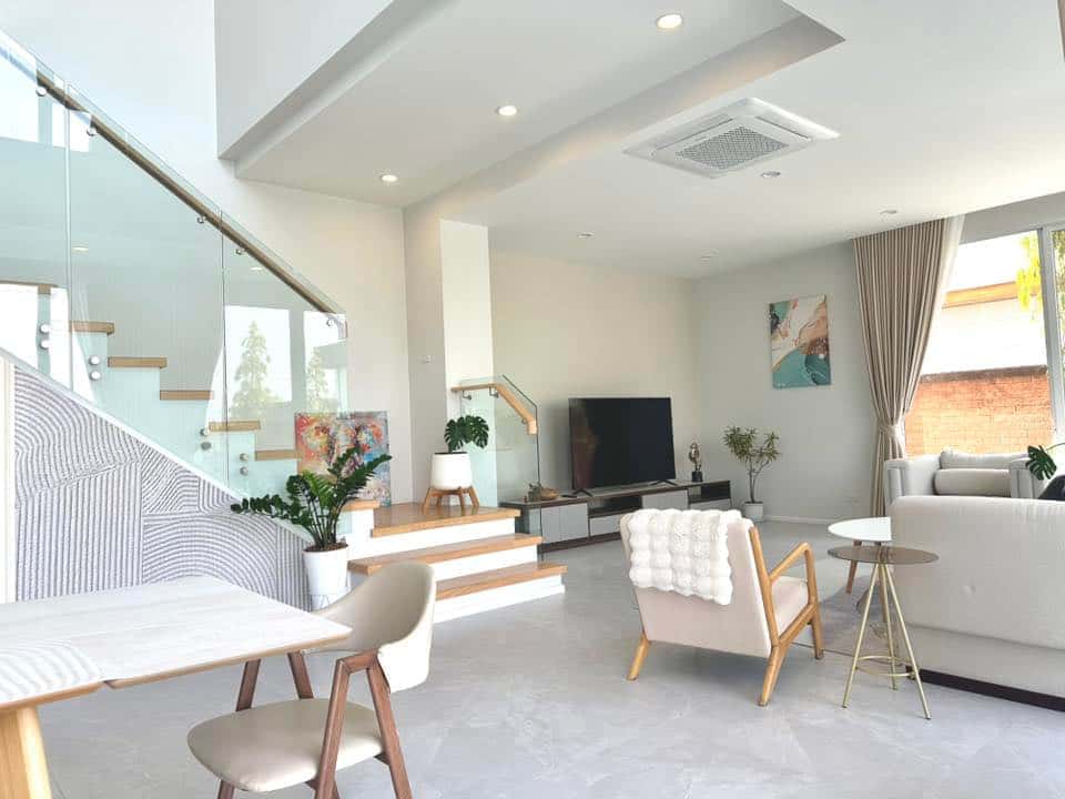 ห้องนั่งเล่นกว้างขวาง พร้อมโซฟาขนาดใหญ่ แอร์ ทีวี และตกแต่งอย่างสวยงาม