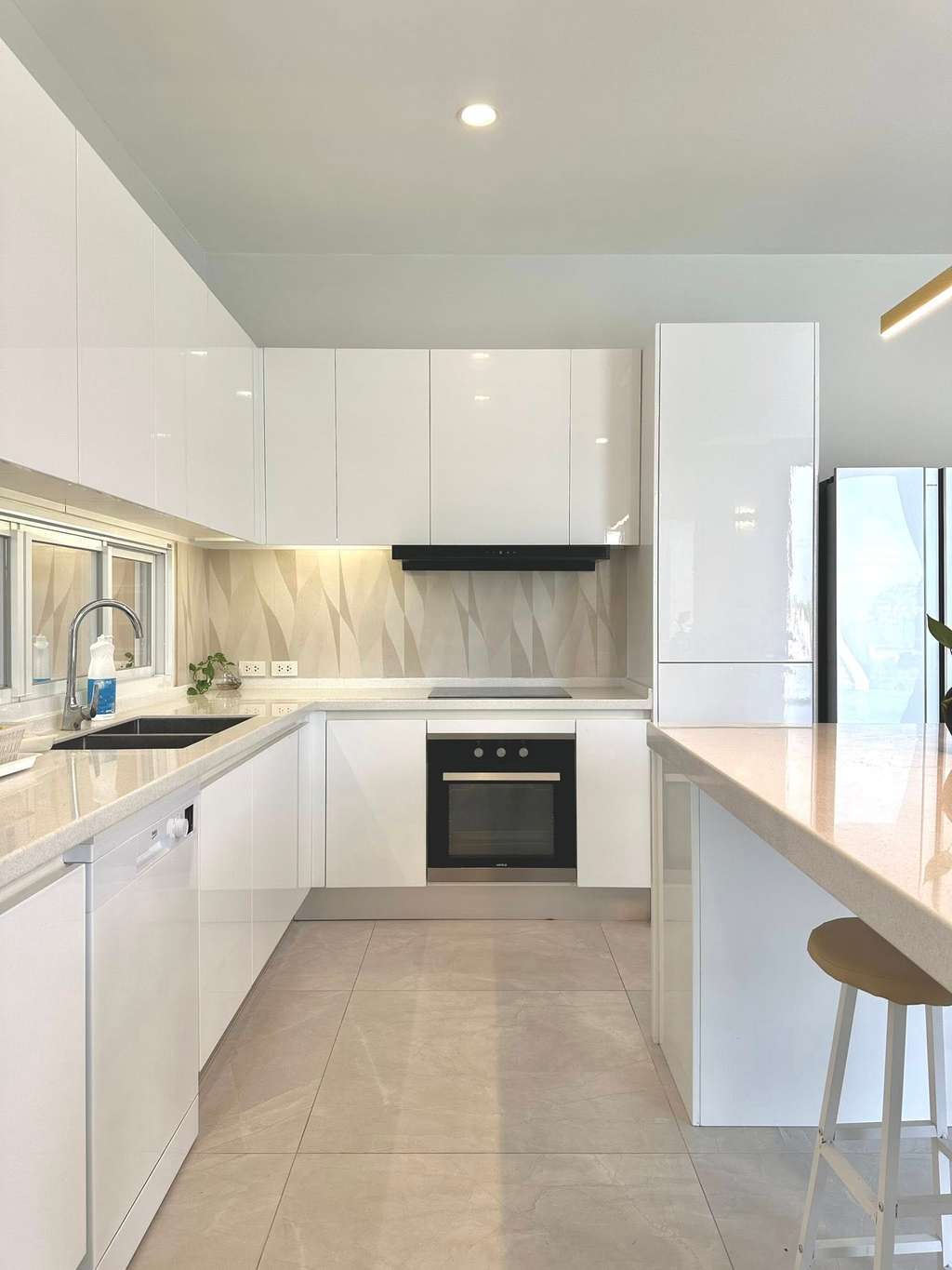西式开放式厨房:内置电器,包括洗碗机、电炉、烤箱、燃气灶、微波炉、冰箱及大餐桌