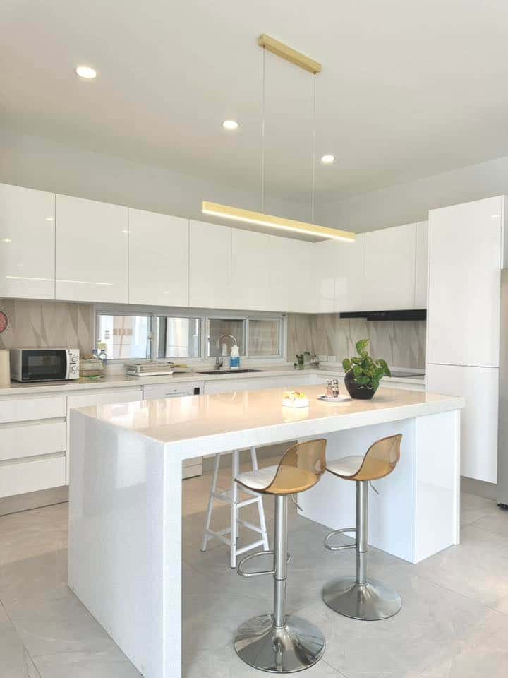 ครัวตะวันตกสไตล์เปิด พร้อมอุปกรณ์ครบชุด: เครื่องล้างจาน เตาไฟฟ้า เตาแก๊ส เตาอบ ไมโครเวฟ ตู้เย็น และโต๊ะรับประทานอาหารขนาดใหญ่