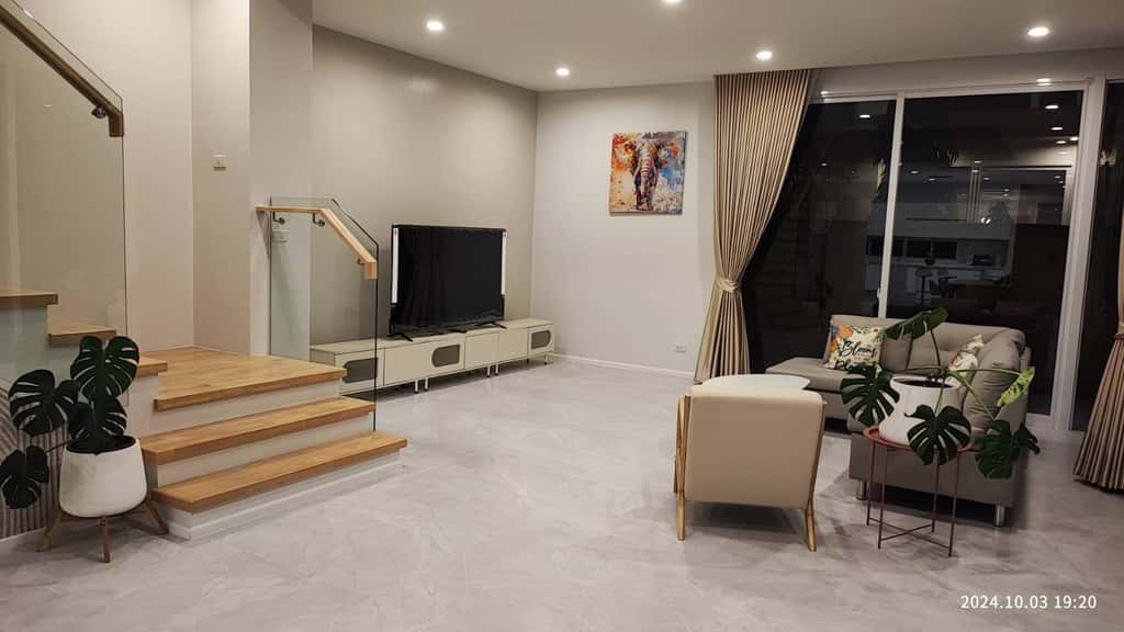 ห้องนั่งเล่นกว้างขวาง พร้อมโซฟาขนาดใหญ่ แอร์ ทีวี และตกแต่งอย่างสวยงาม